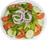 Lettuce, tomatoes, onion, cucumber, bell pepper.